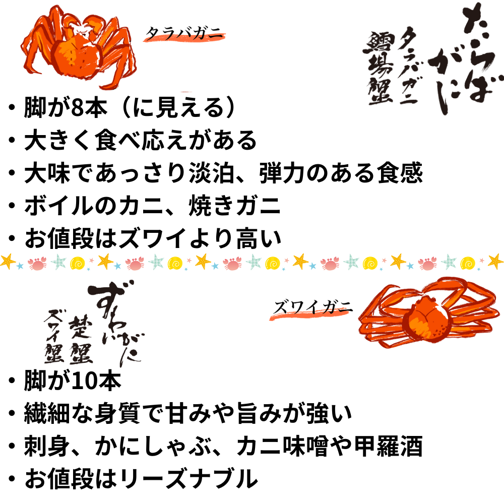 | タラバガニ・ ズワイガニ・ 毛ガニ・ トゲズワイガニ・ 紅ズワイガニ・ 松葉がに |