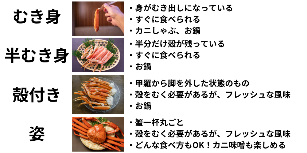 カニの食べ方は様々あるので、用途や好みに合ったものでご検討ください。